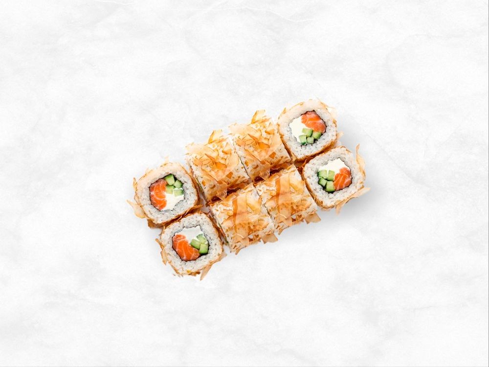 лосось, сливочный сыр, огурец, стружка тунца