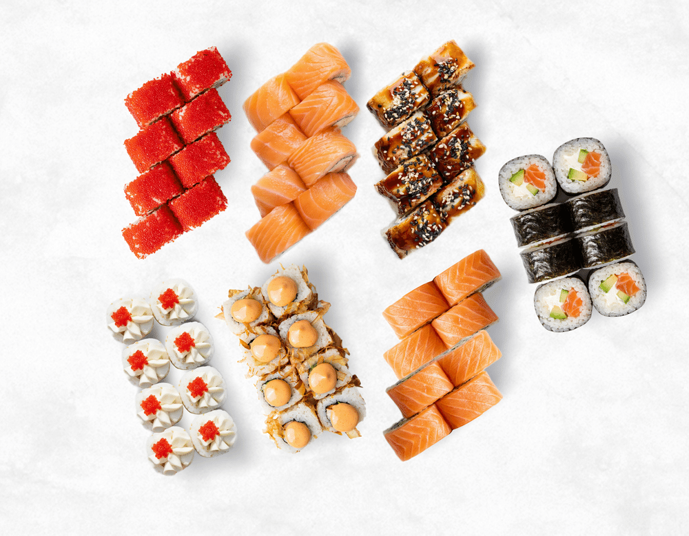 Филадельфия классик, калифорния с крабом, унаги биг, лилия, бостон, лосось сливочный, амазонка.