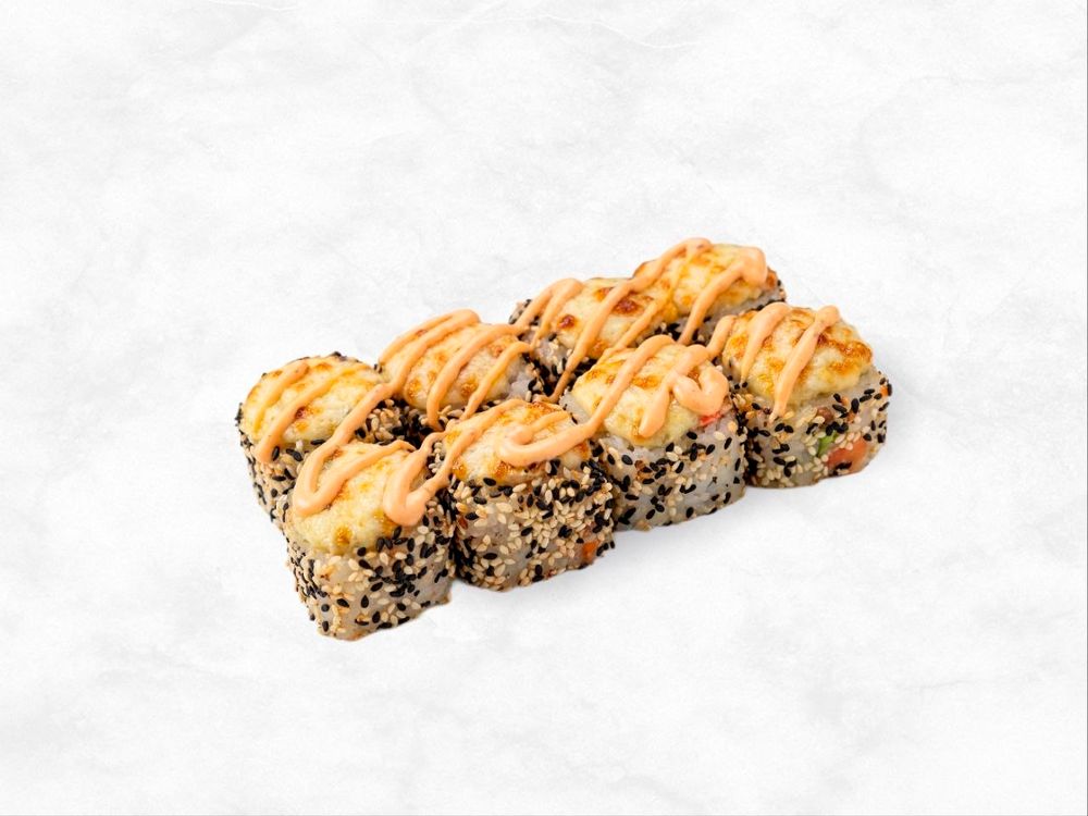 Состав лосось, спайси соус, огурец, майонез, сыр гауда, кунжут