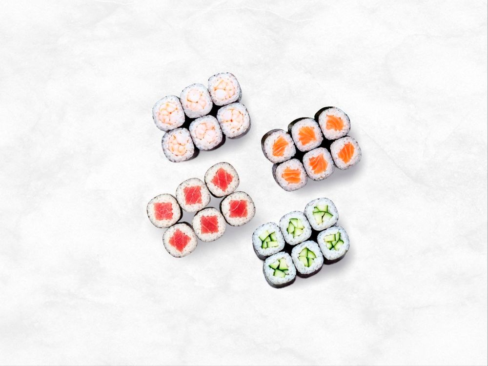 Мини с лососем, мини с огурцом, мини с крабом, мини с тунцом