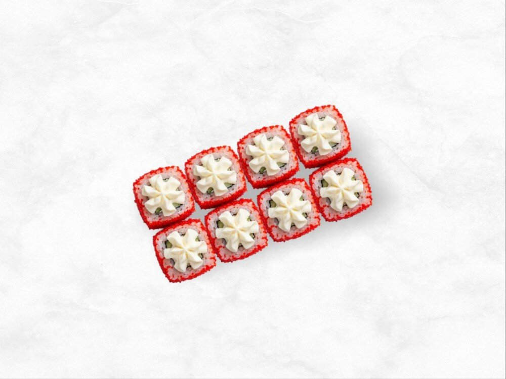 Имитация краба, огурец, сливочный сыр, икра тобико.
