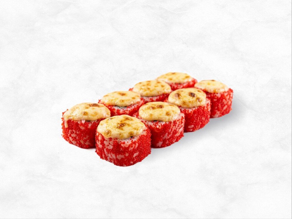 Имитация краба, сливочный сыр, огурец, майонез, сыр гауда, икра тобико.